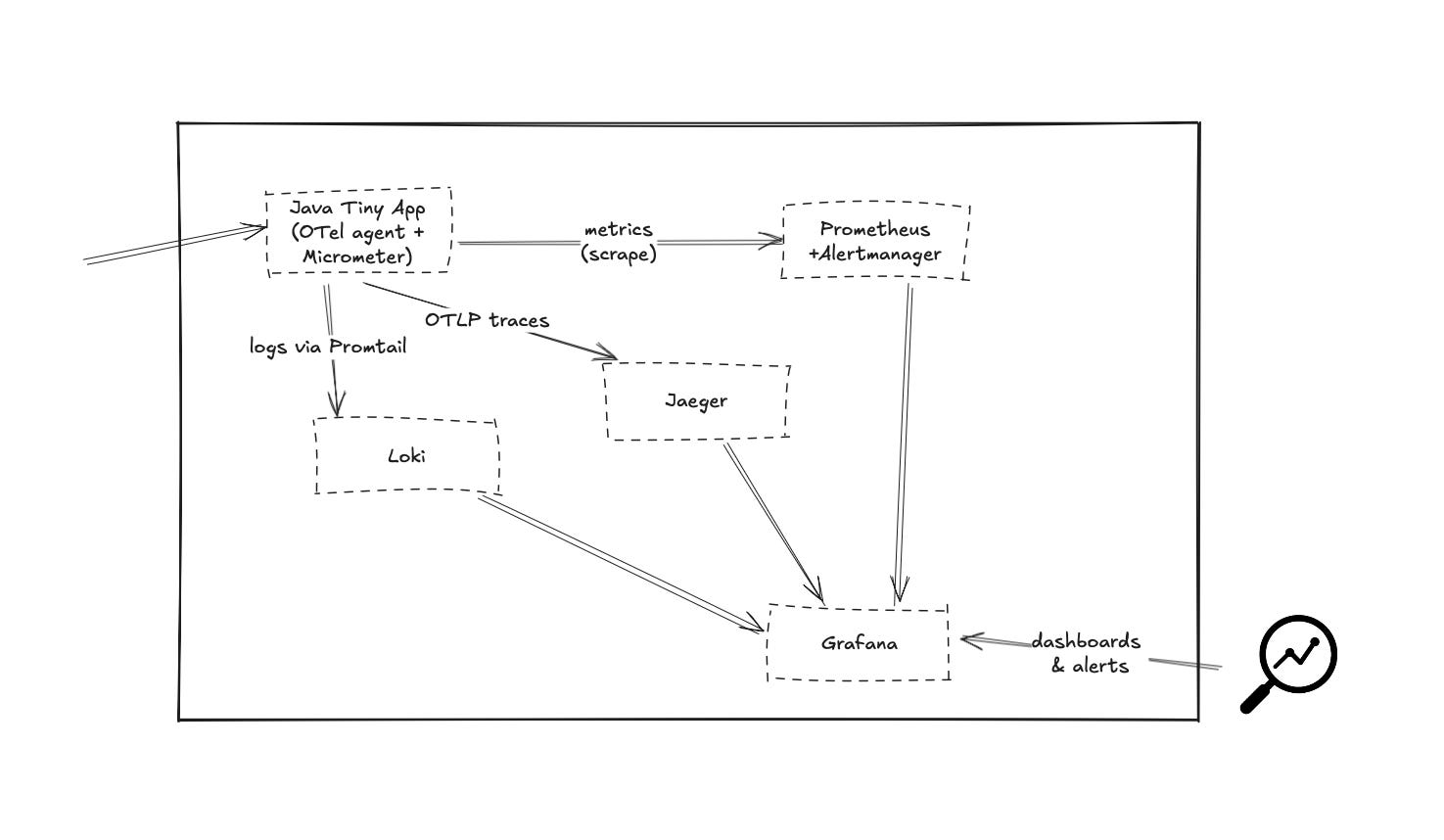 Goal: Spin up Prometheus+Alertmanager, Loki+Promtail, Jaeger, and Grafana with a single docker‑compose.yml, then watch a tiny Java HTTP service emit metrics, logs, and traces—all in less than an hour.